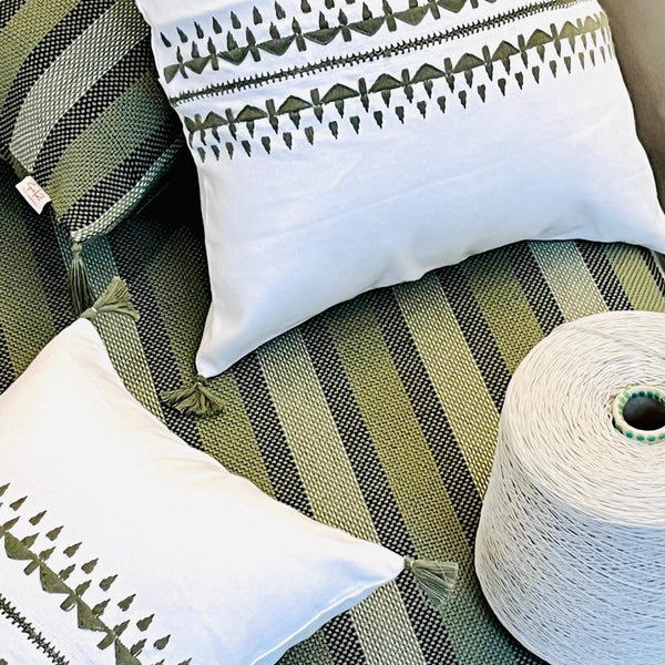 Il pouf Motivo Donna presenta un design raffinato con eleganti gambe in legno e un rivestimento in tessuto verde kaki realizzato su telai tradizionali in legno in Italia.